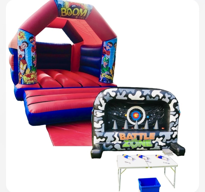 This is our super hero children’s bouncy castle and nerf shootout party package which is ideal for any superhero’s birthday party! A full entertainment package where the kids can bounce to their hearts content then try and use their super powers to shoot the floating balls off the targets!