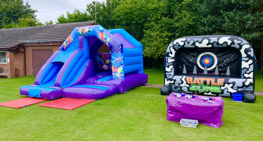 Looking for the ultimate party entertainment that will thrill both kids and adults? Our bouncy castle hire, Party Combi Bouncy Castle and Nerf Shootout package in Bromsgrove, Redditch, Droitwich, Barnt Green, Chaddesley Corbett and all surrounding Worcestershire areas is the perfect choice for your next celebration! This all-in-one party solution combines the excitement of a vibrant bouncy castle and slide with the competitive fun of a Nerf shootout, ensuring hours of laughter and unforgettable memories for everyone.